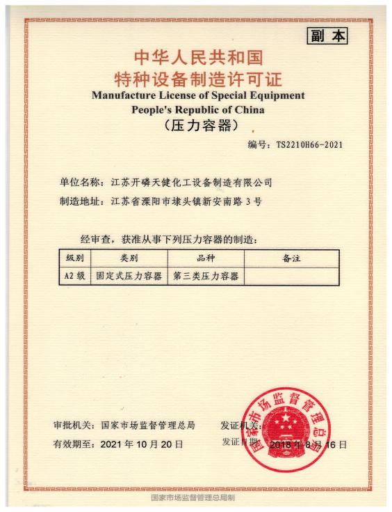 8月28日,天建公司收到由国家市场监督管理总局颁发的编号为:TS2210H66-2021,有效期至2021年10月20日的A2级压力容器制造许可证,获准从事A2级固定式压力容器第三类压力容器的制造,标志着天健公司四年一次的压力容器证复审换证工作圆满完成。